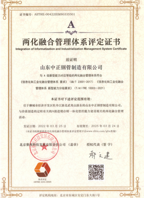 兩化融合管理體系評(píng)定證書 |